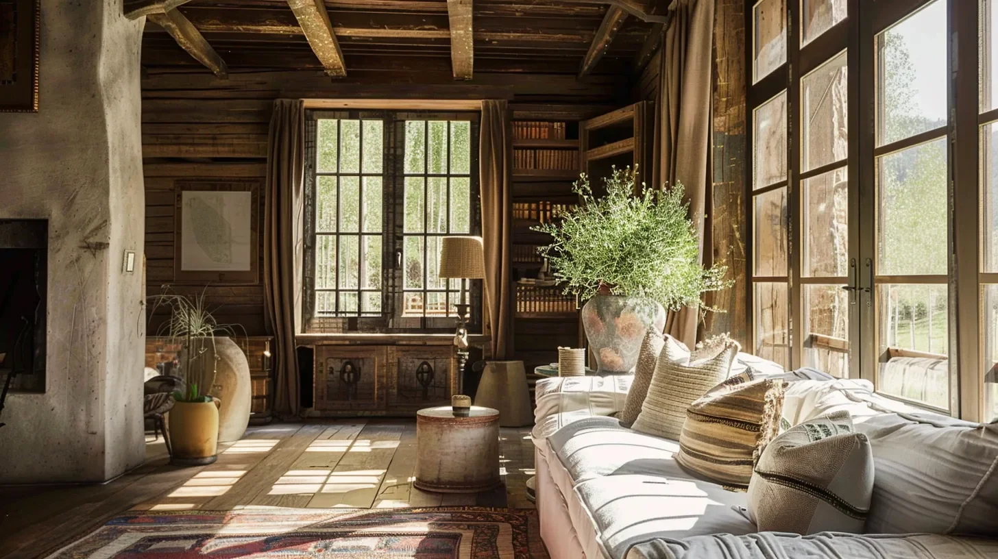 Sisustuksessa korostuvat puu, kivi, metalli ja savi, jotka tuovat tilaan lämpöä ja tekstuuria. Huonekalut ovat massiivisia, yksinkertaisia ja usein käsintehtyjä, ja kuluneet pinnat luovat viehättävää patinaa. Luonnonmateriaalit, kuten villa ja pellava, lisäävät pehmeyttä. Tyyli on rennon kodikas, mutta silti harmoninen.
